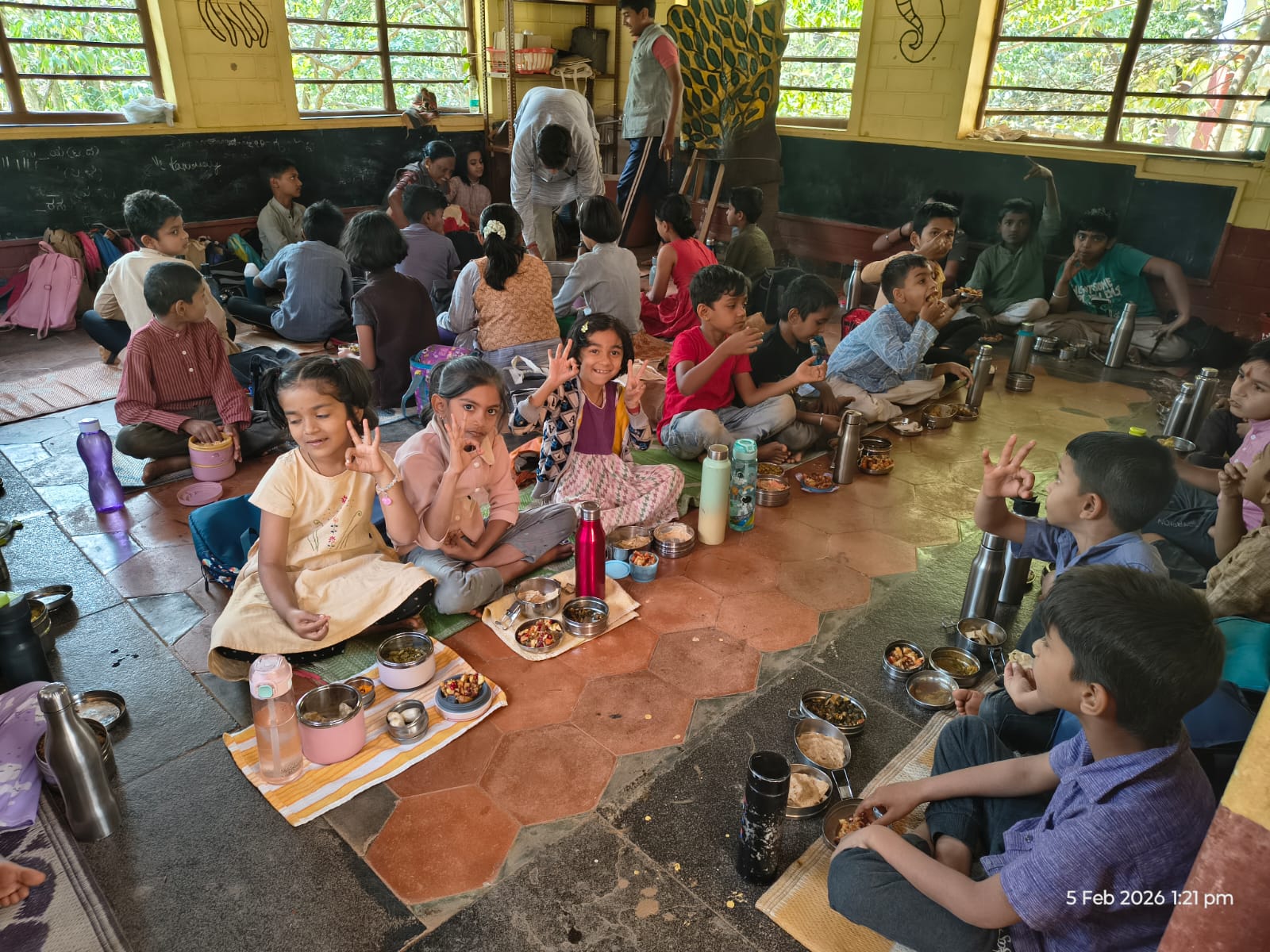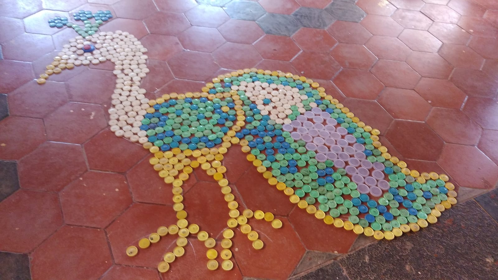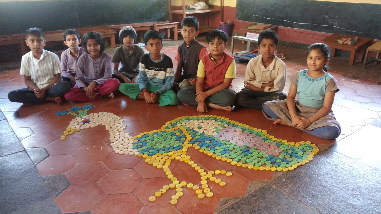 ಇಂದು ಚಟುವಟಿಕೆ ತರಗತಿಯಲ್ಲಿ ಮಕ್ಕಳೆಲ್ಲ ಸೇರಿ ಮುಚ್ಚಳಗಳನ್ನು ಬಳಸಿ ಈ ವಿನ್ಯಾಸವನ್ನು ಮಾಡಿದ್ದಾರೆ. ಎಲ್ಲರೂ ಕೂಡಿಕೊಂಡು ಒಂದೇ ವಿನ್ಯಾಸವನ್ನು ಮಾಡುವುದರಿಂದ ಮಕ್ಕಳು ಹೊಂದಾಣಿಕೆಯನ್ನು ಕಲಿಯುತ್ತಾರೆ ಈ ಚಟುವಟಿಕೆಯಿಂದ ಅವರಲ್ಲಿ ಸೃಜನಾತ್ಮಕ ಕಲೆಯನ್ನು ಹೆಚ್ಚಿಸಬಹುದು. ಬೌದ್ಧಿಕ ಬೆಳವಣಿಗೆ ಆಗುತ್ತದೆ.